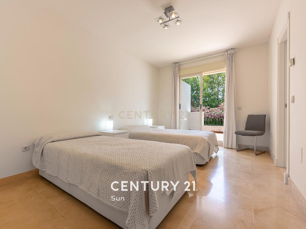 La planta superior alberga un espacioso dormitorio con baño en suite, una gran terraza con vistas panorámicas al campo de golf y un solárium orientado al oeste, ideal para disfrutar de las tardes.